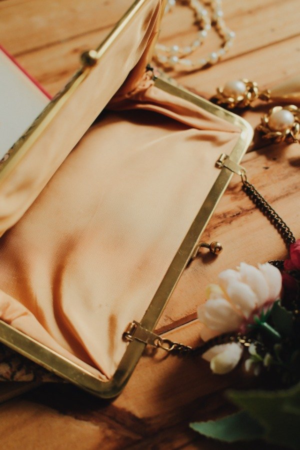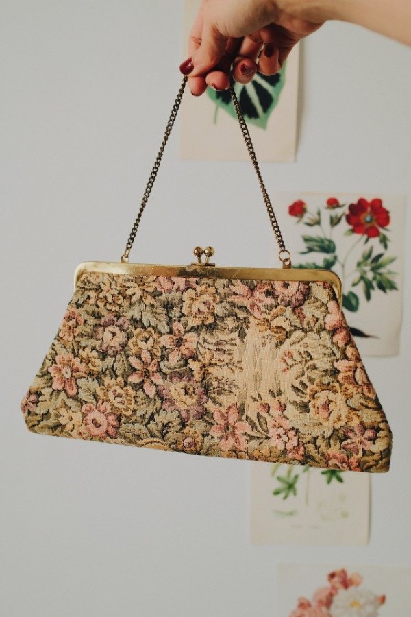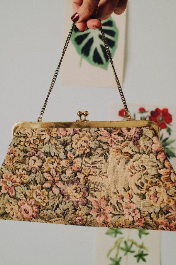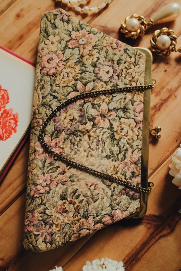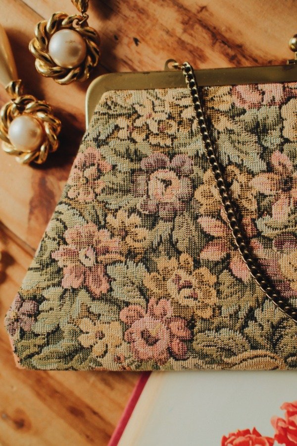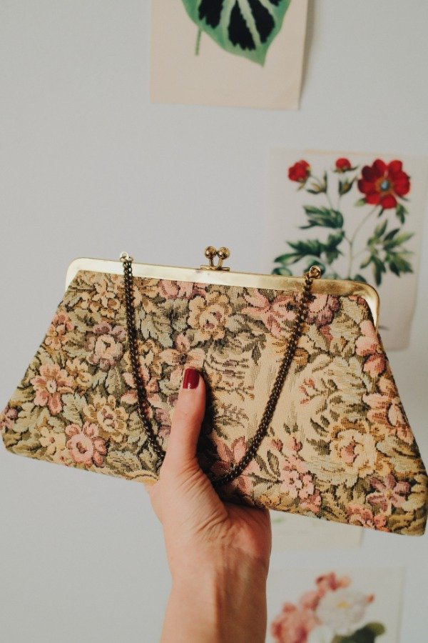 Cartera hecha en USA en petit point con cierre y tira metálica, forrada en raso.