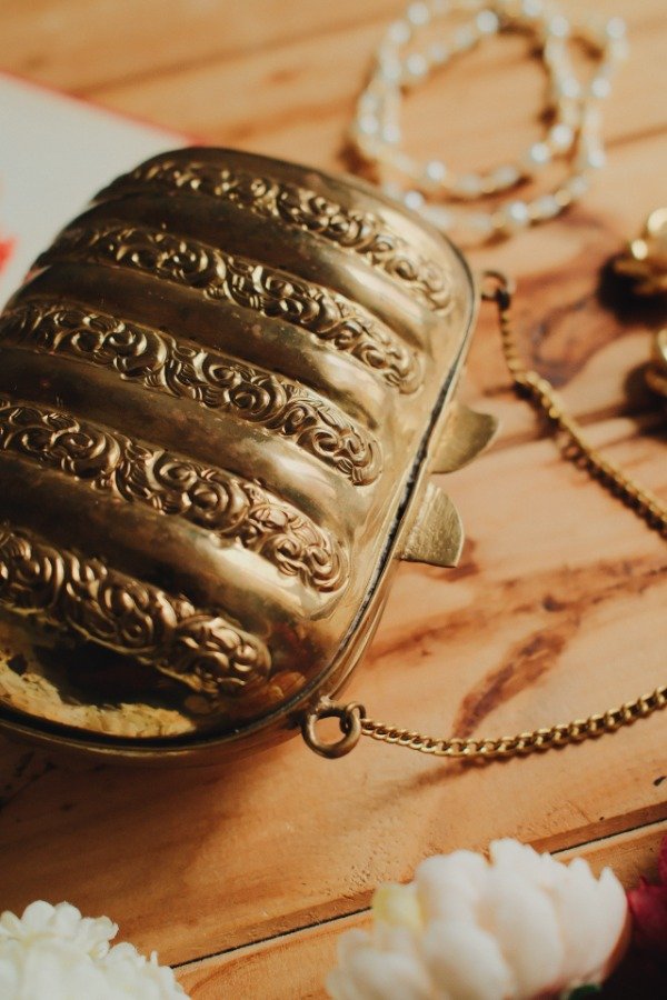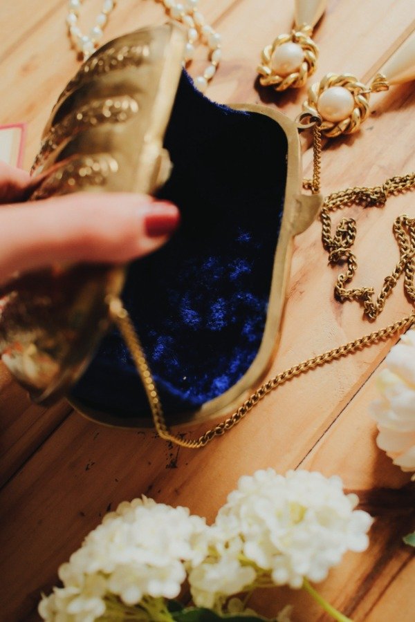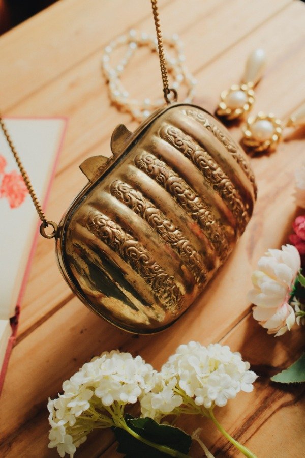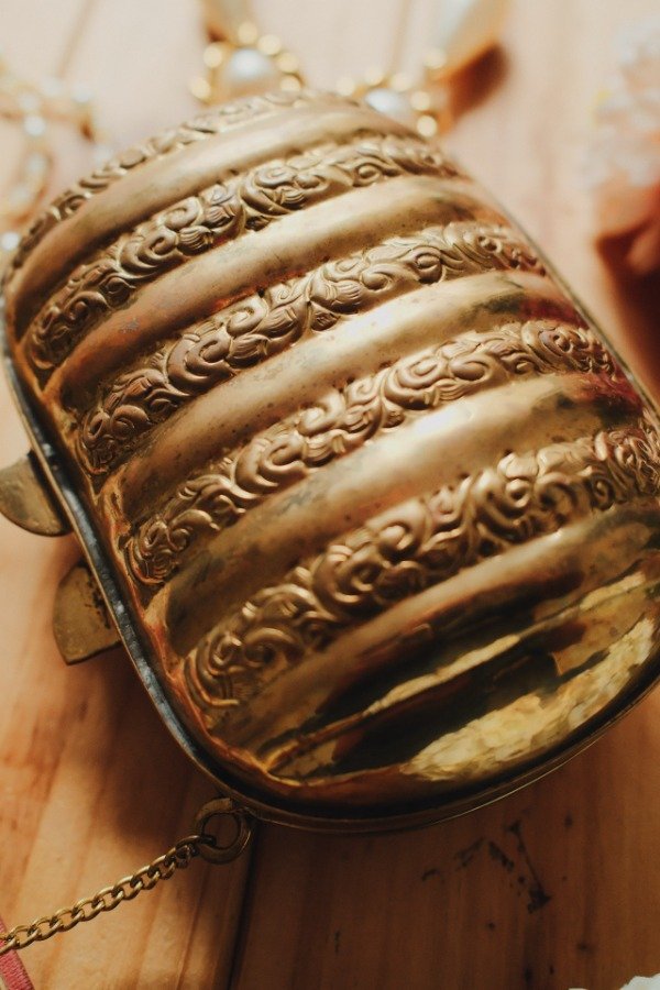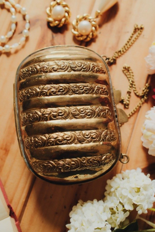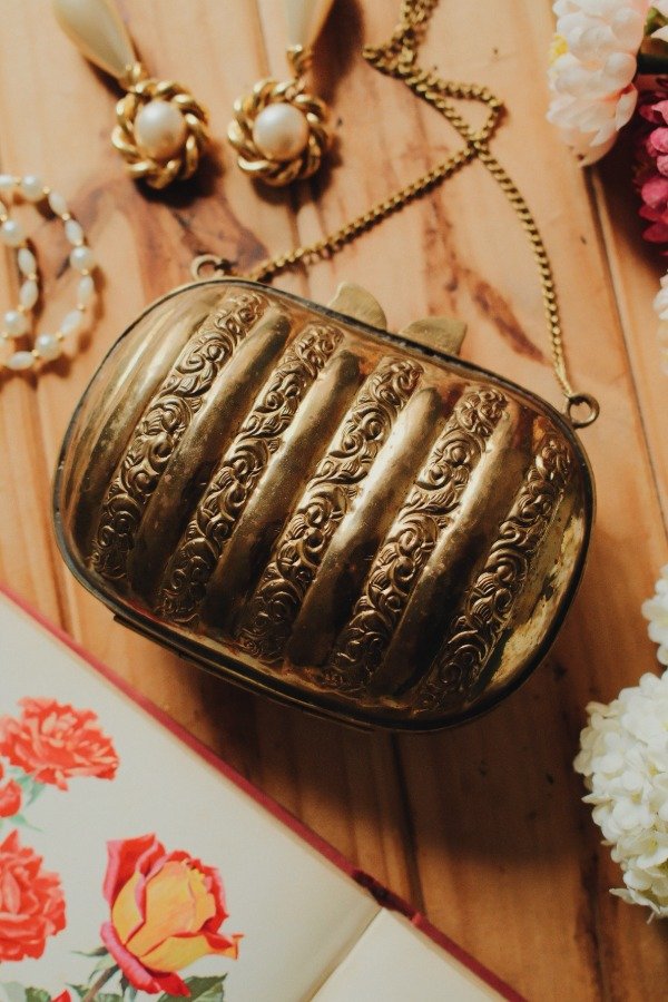 Cartera antigua de metal labrado, forrada en terciopelo.