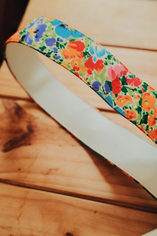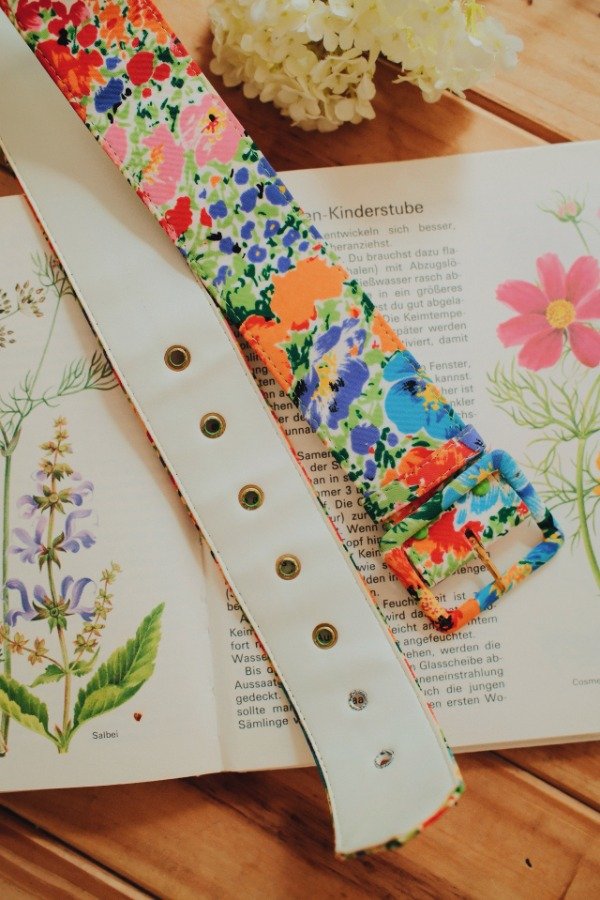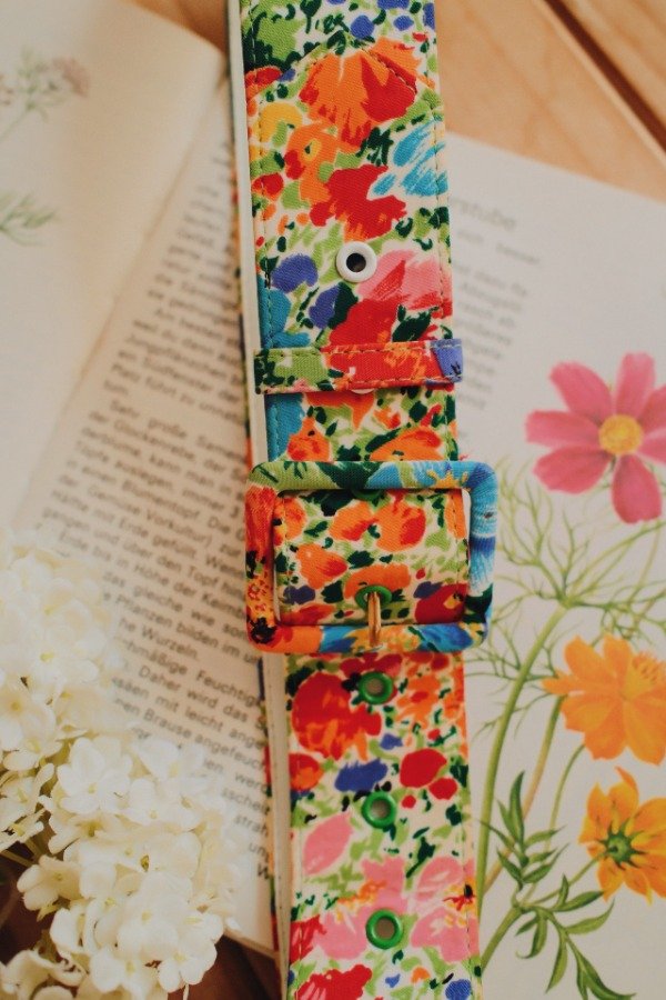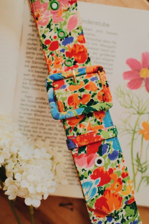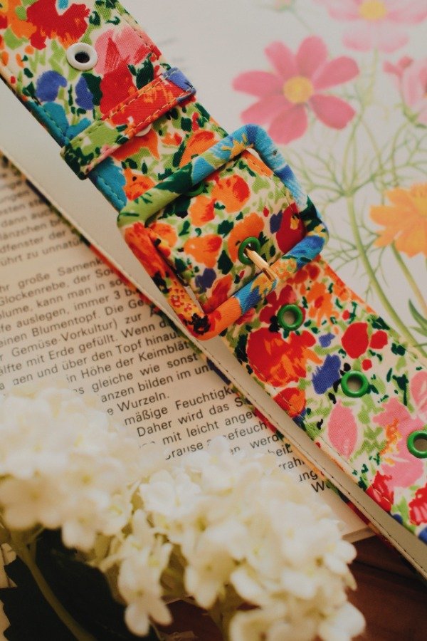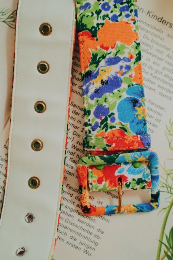 Cinturón estampado de poliester y cuerina.