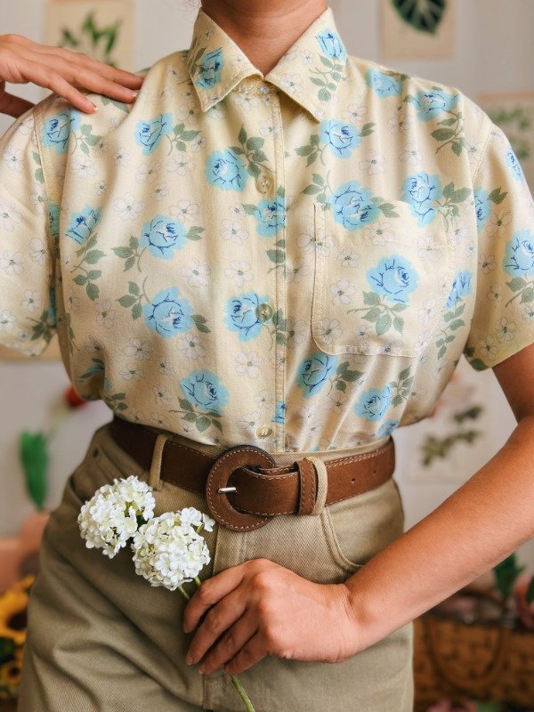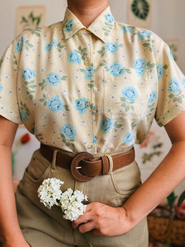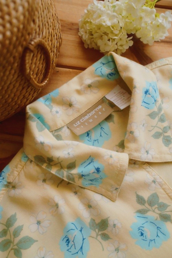 Camisa Liz Claiborne estampada con botones y un bolsillo. Tiene dos botones de repuesto.