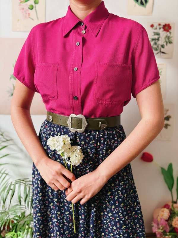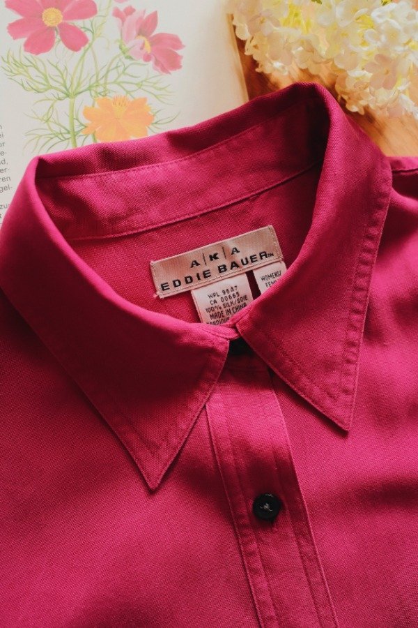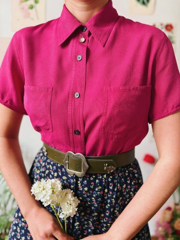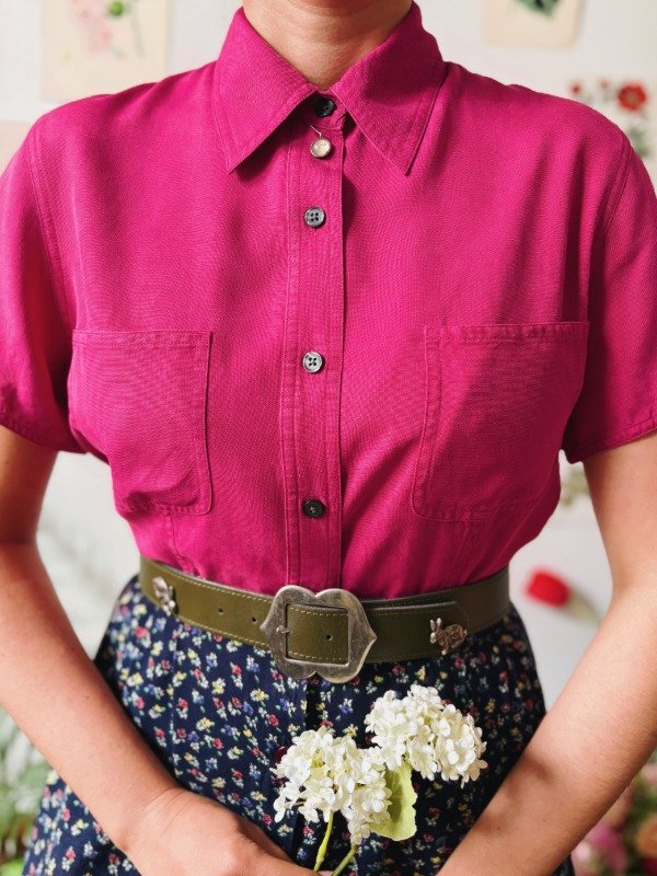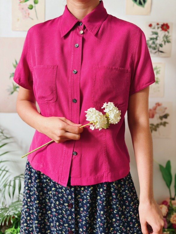 Camisa de seda gruesa, con dos bolsillos frontales y botones. Tiene un botón de repuesto.