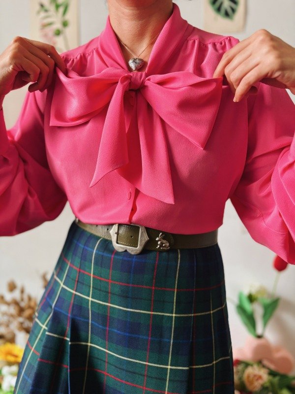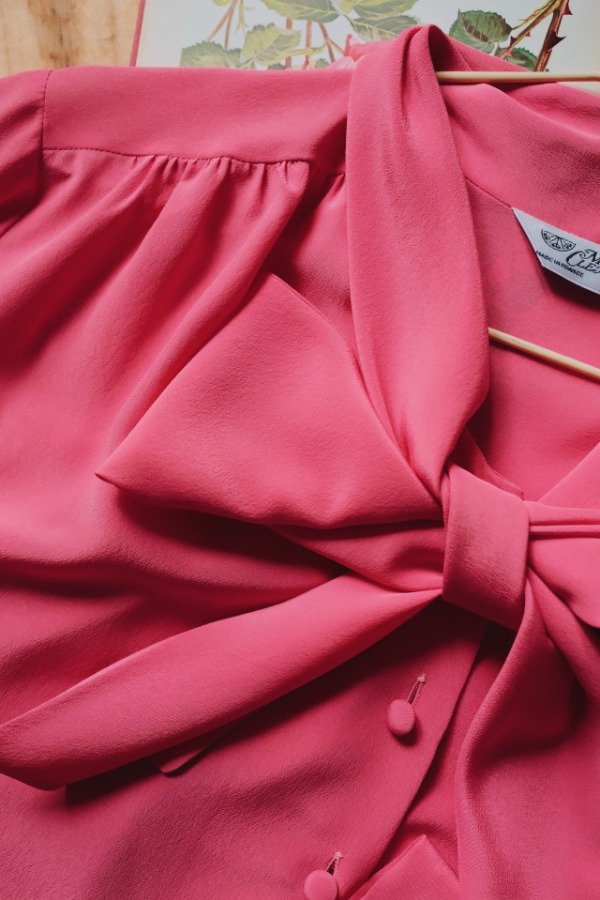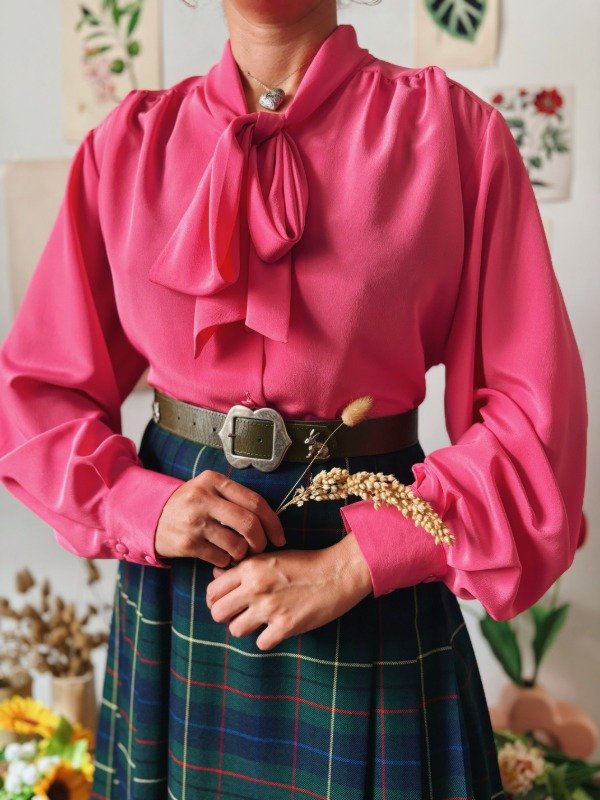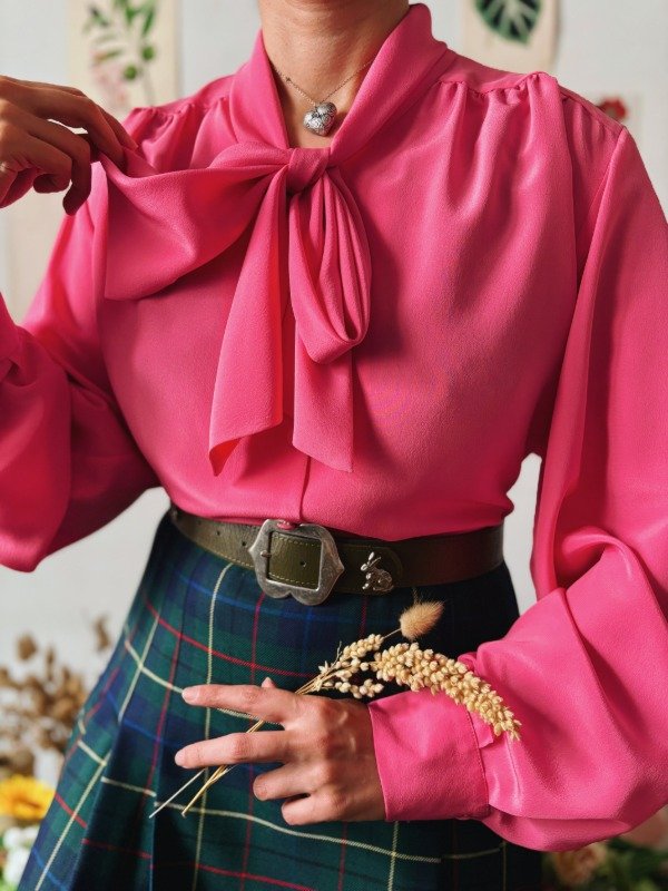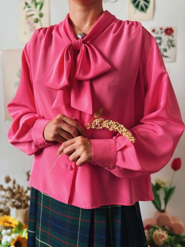 Camisa hecha en Francia con lazo para atar en cuello y botones entelados. Tiene un botón de repuesto.