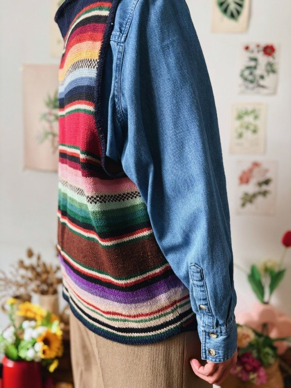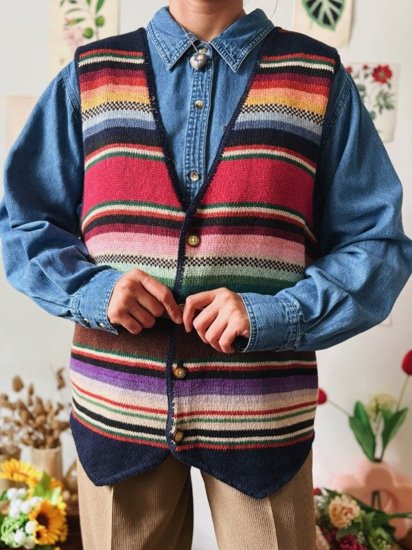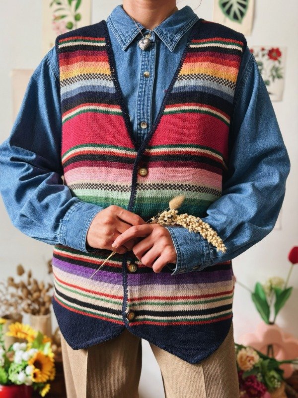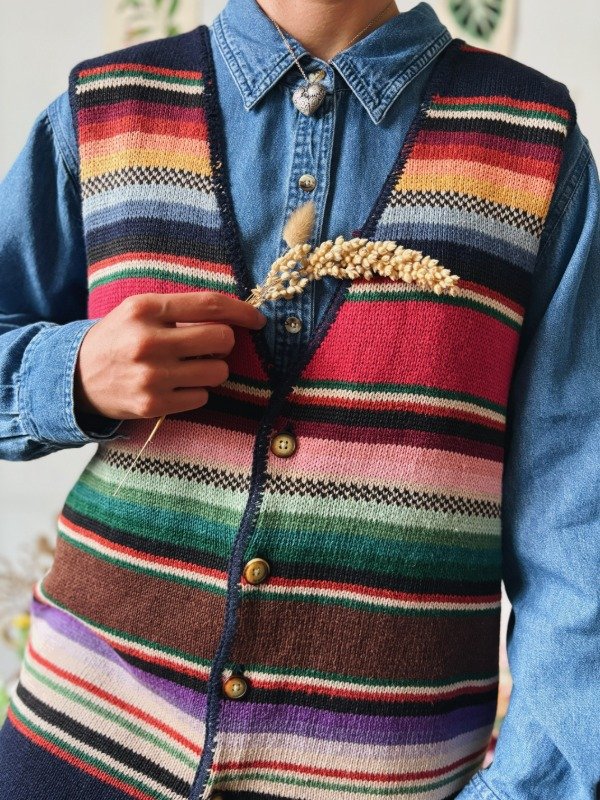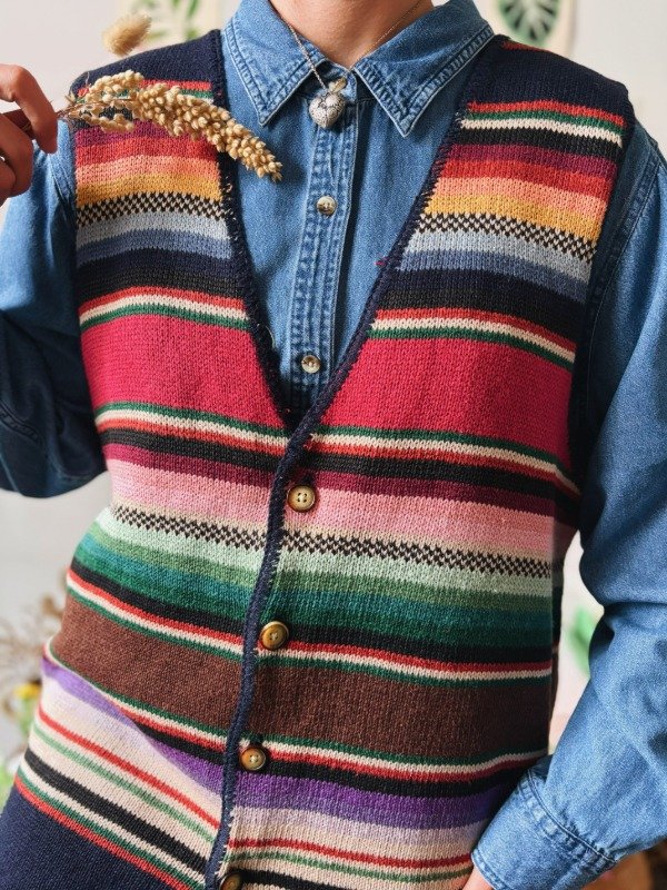 Chaleco tejido a rayas multicolores con botones.
