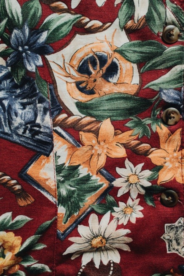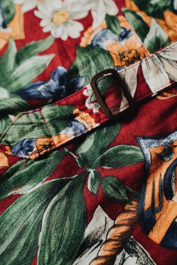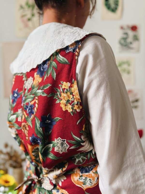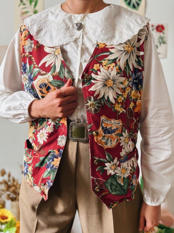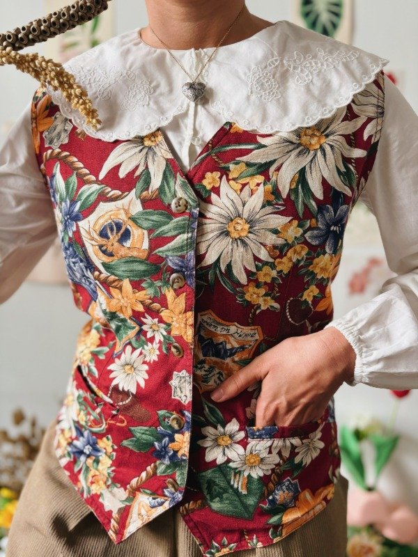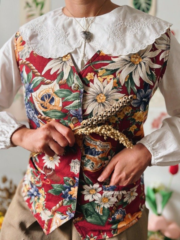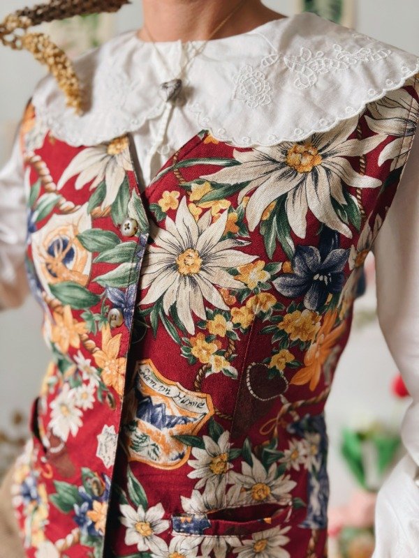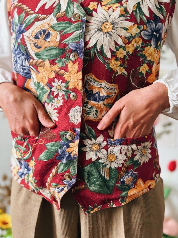 Chaleco hecho en USA, estampado con botones, bolsillos y tira para ajustar en espalda.