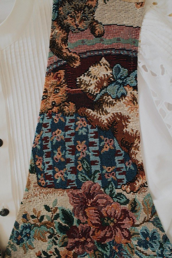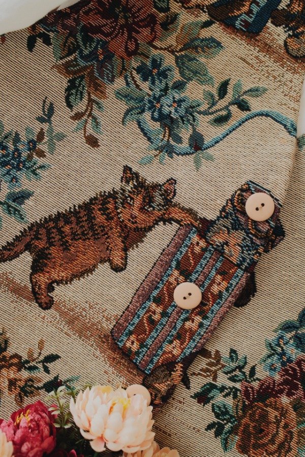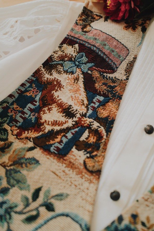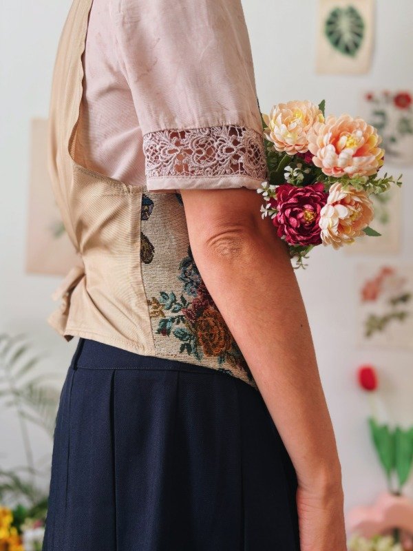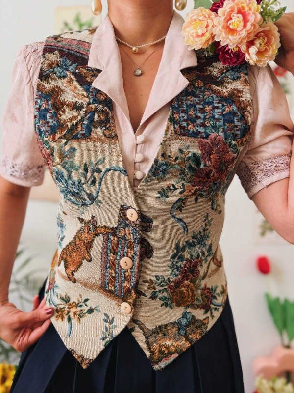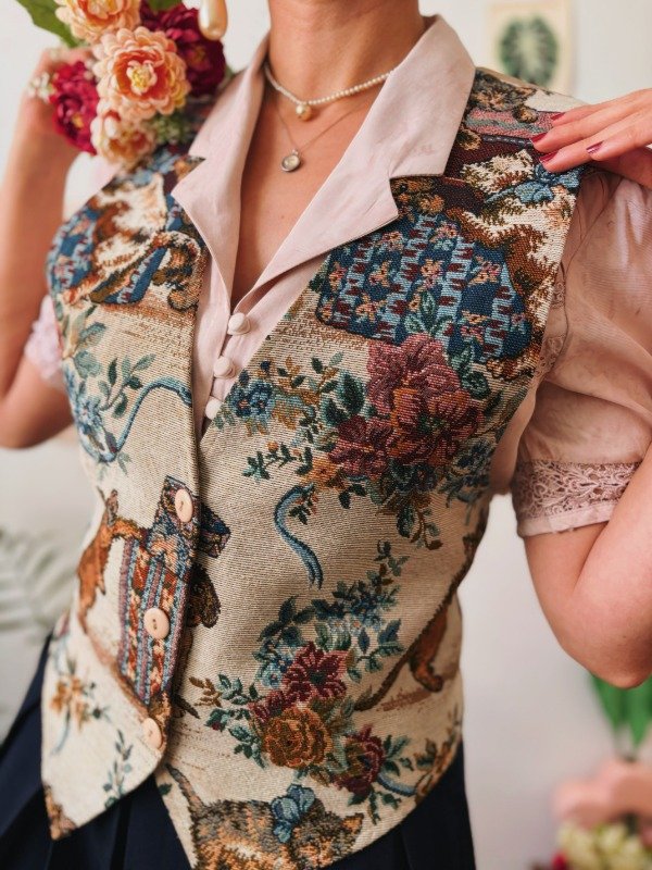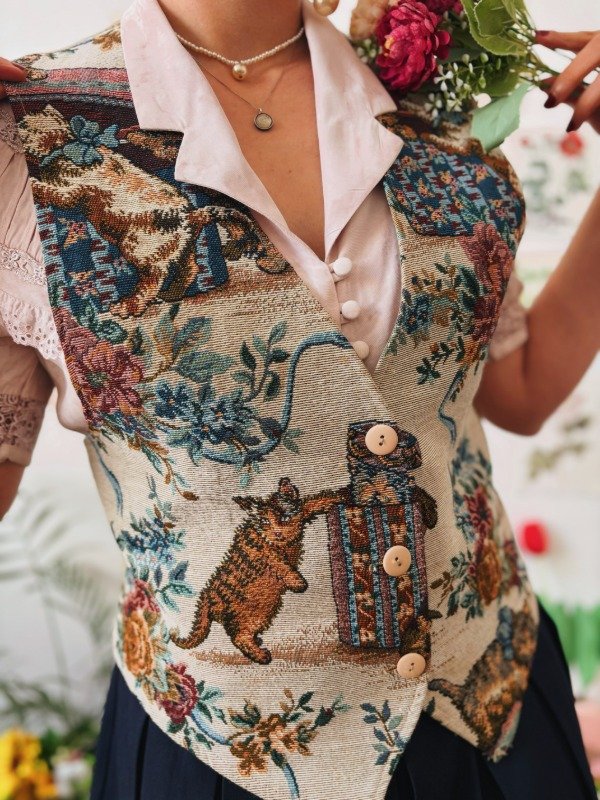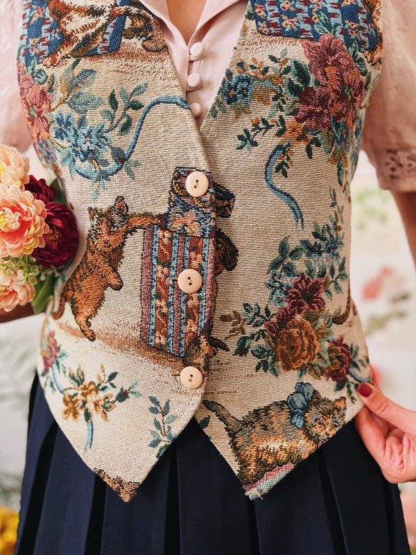 Chaleco de gobelino hecho en USA con botones y tiras para ajustar en espalda.