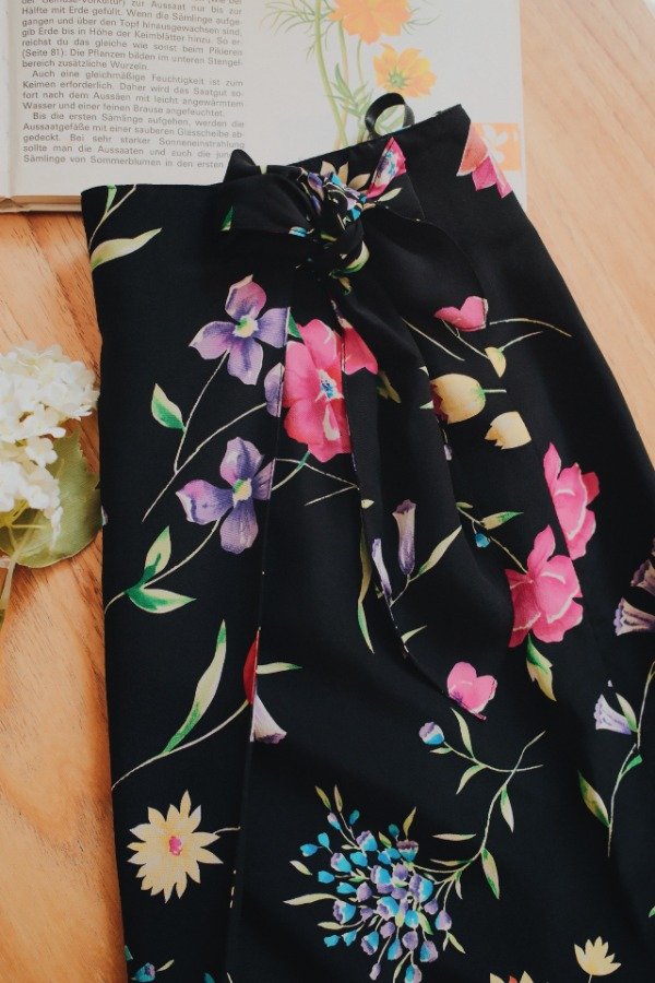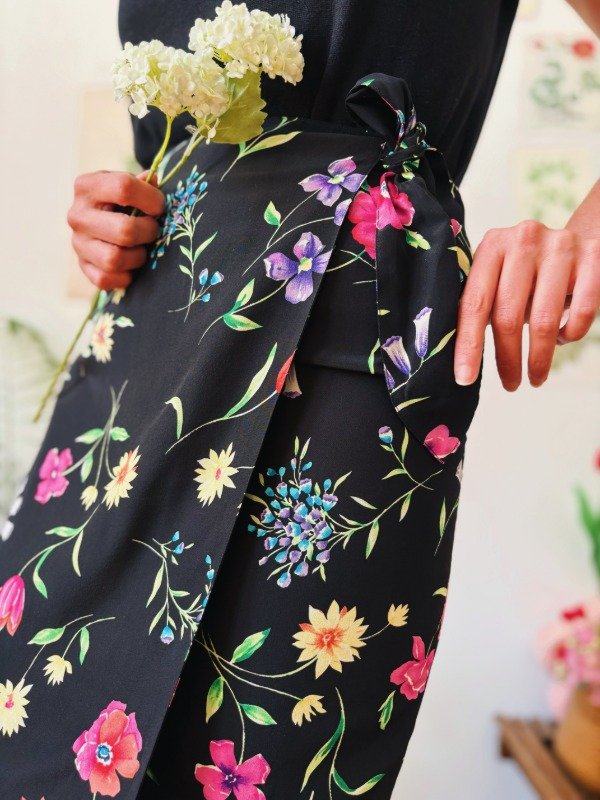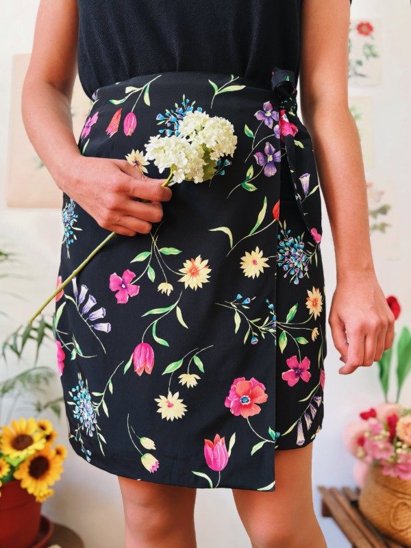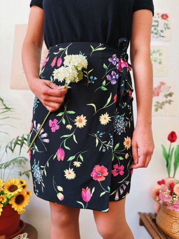 Falda de seda estampada tipo portafolio con lazo para ajustar, un botón y cierre trasero.