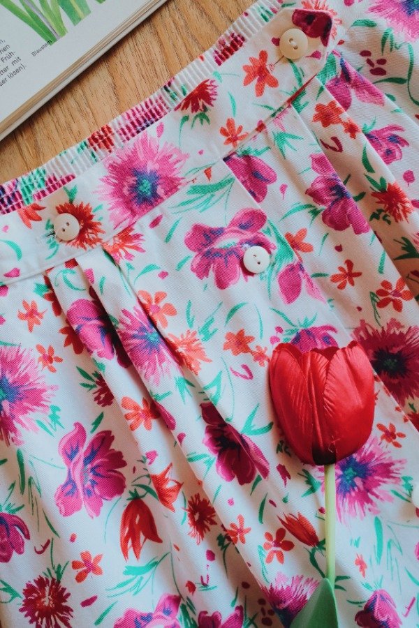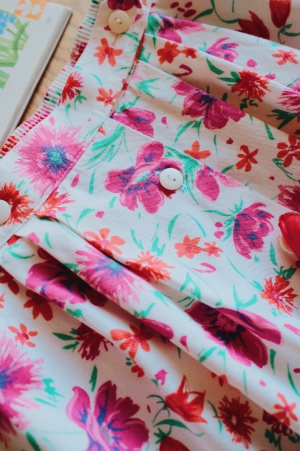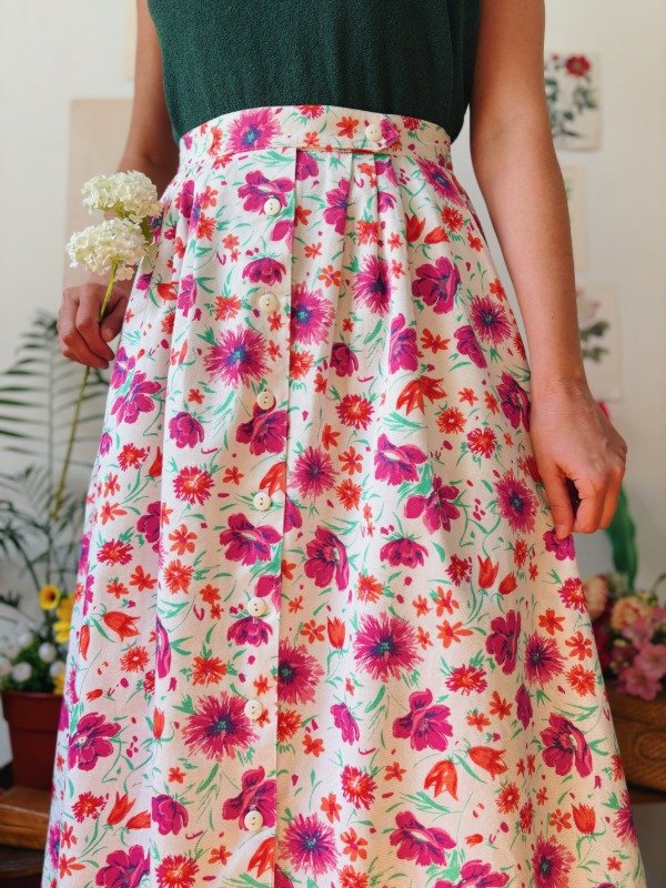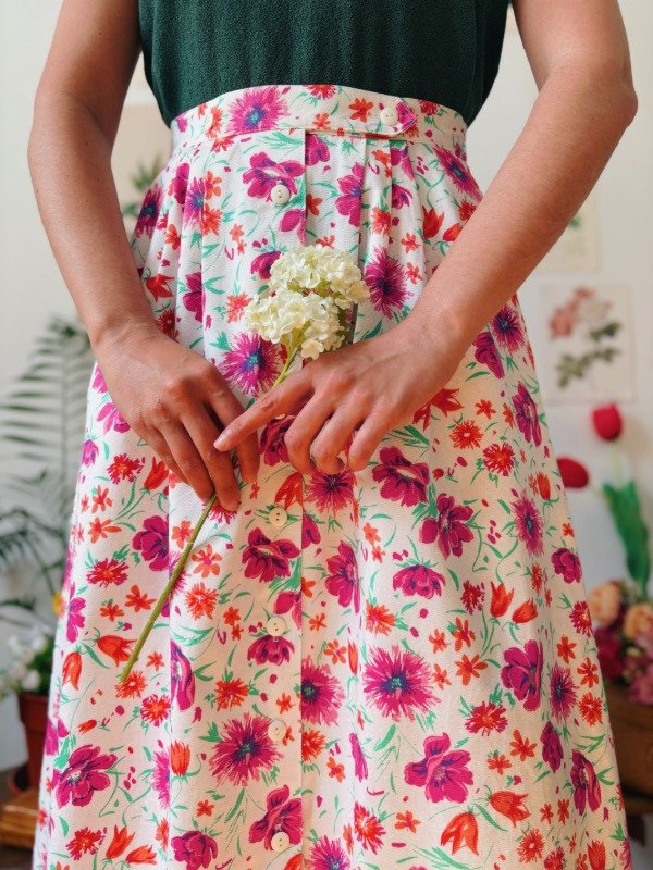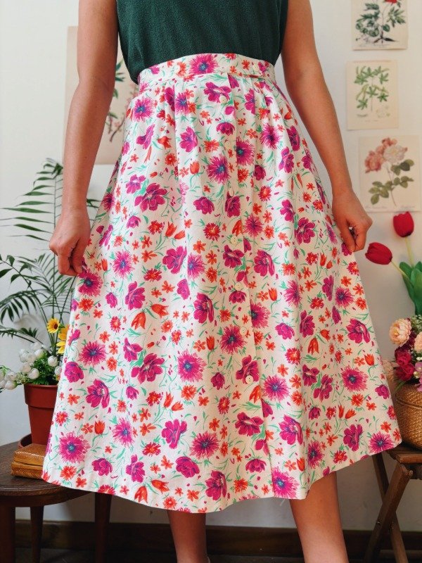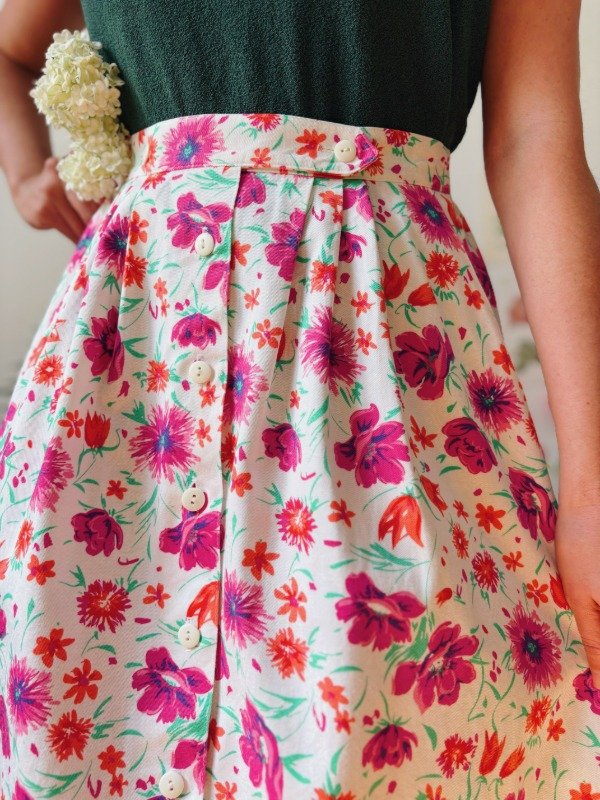 Falda hecha en USA con tablas, botones y bolsillos.