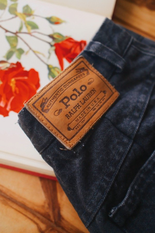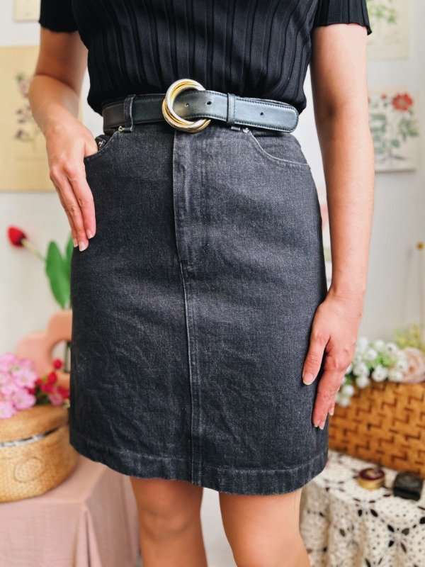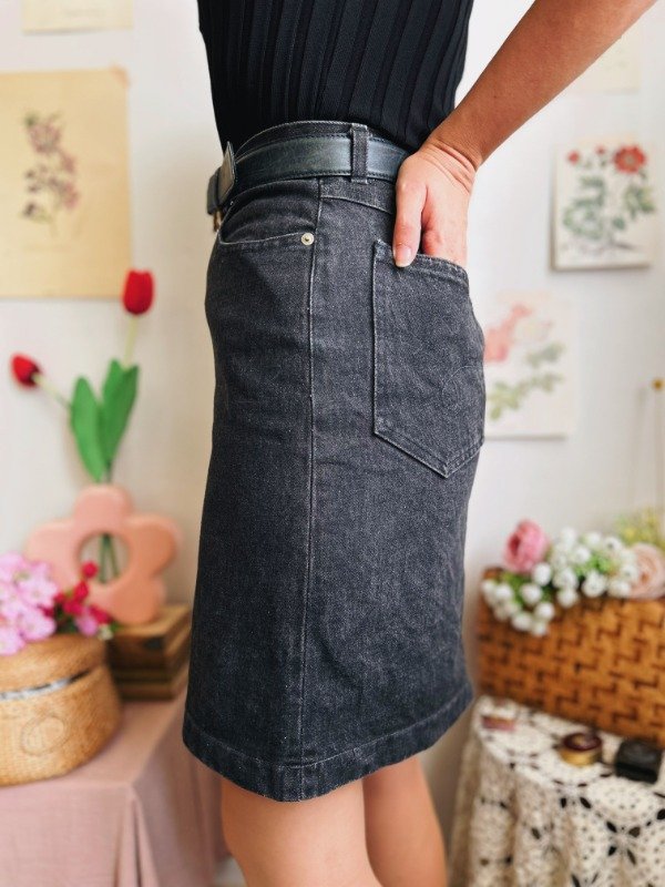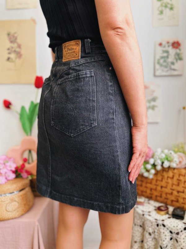 Falda de jean Polo Ralph Lauren hecha en USA con un botón, cierre, pasa cinto y bolsillos.