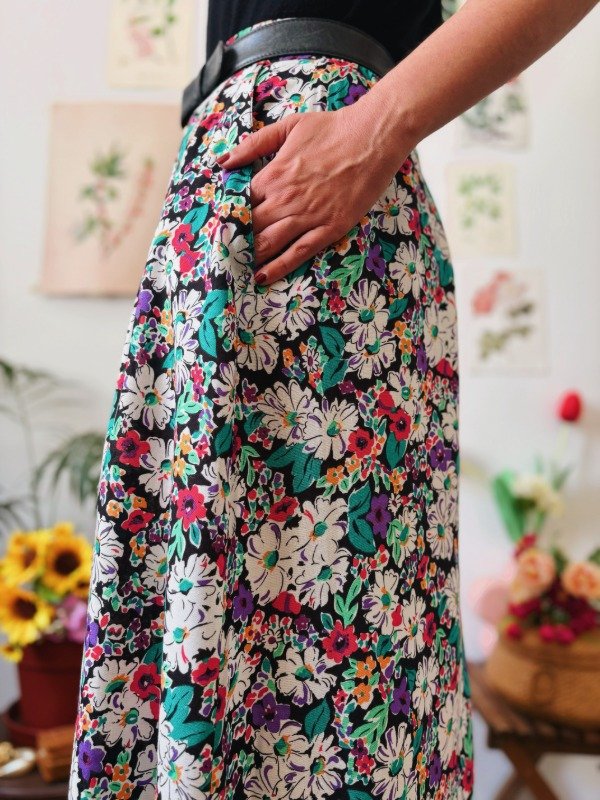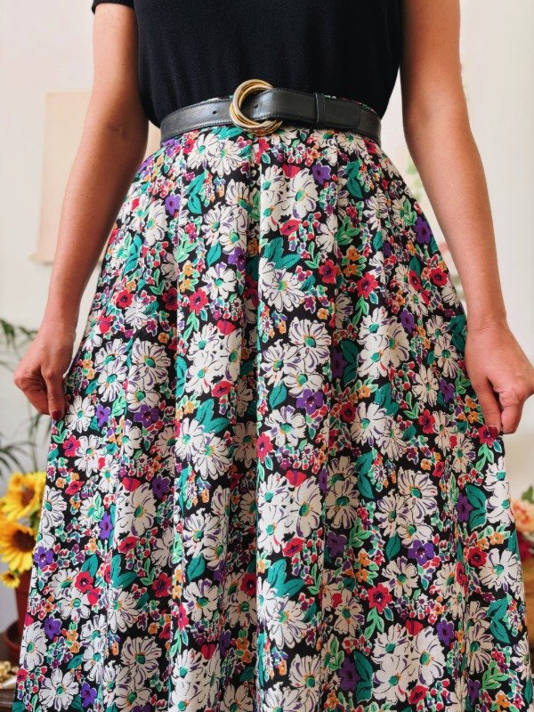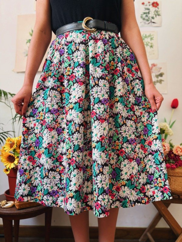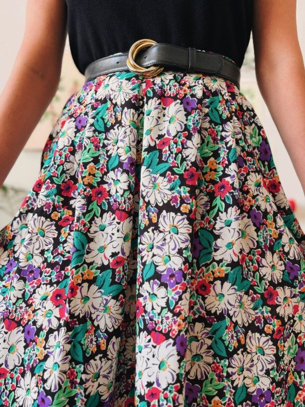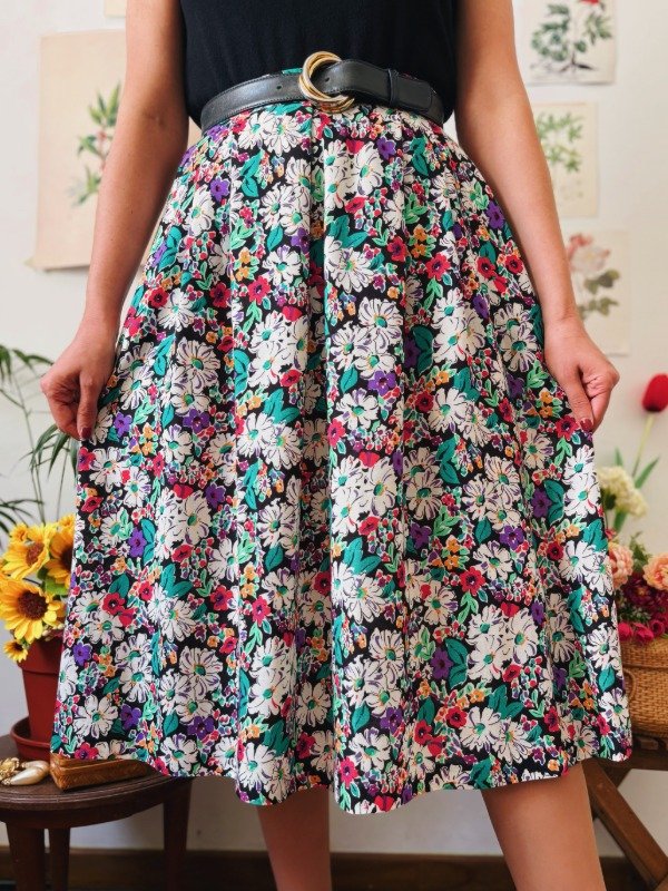 Falda hecha en USA estampada con tablas, bolsillos y un botón.