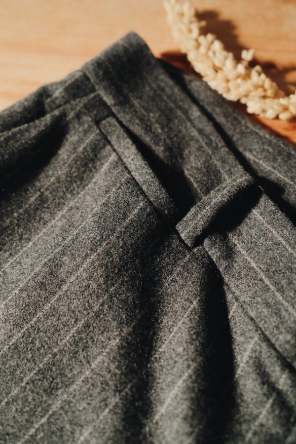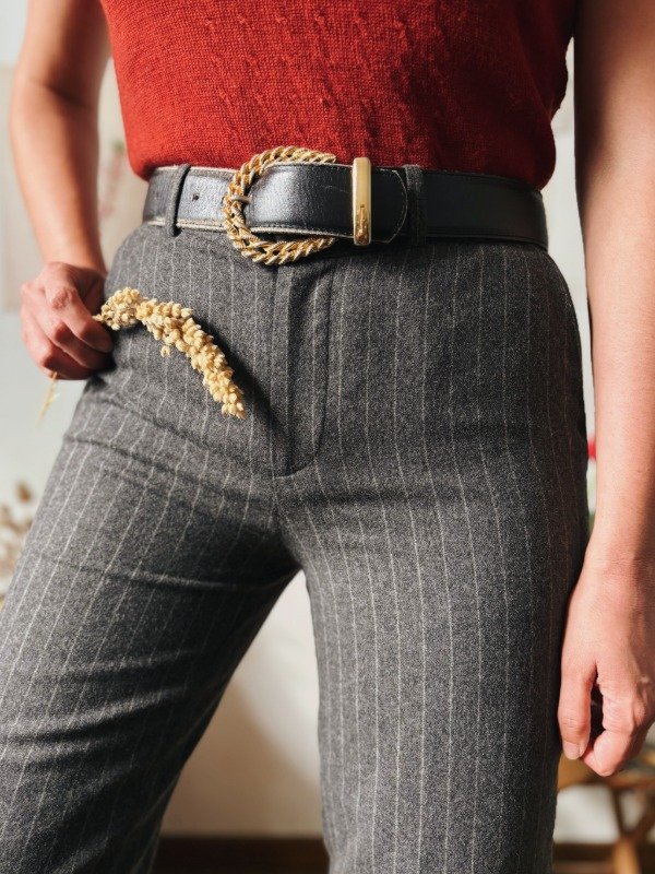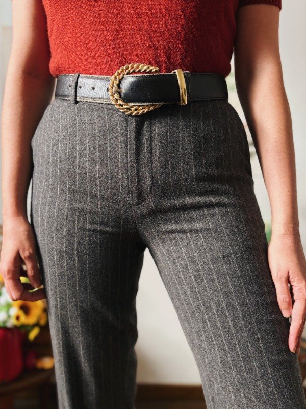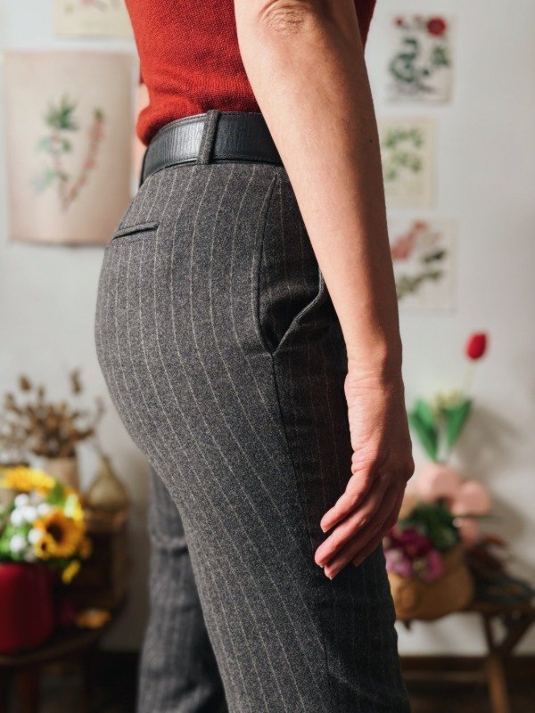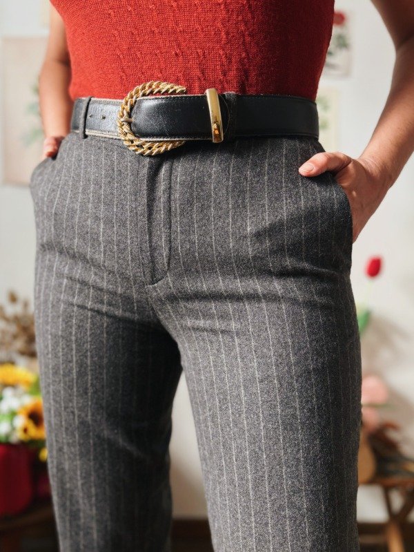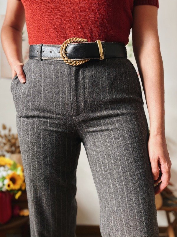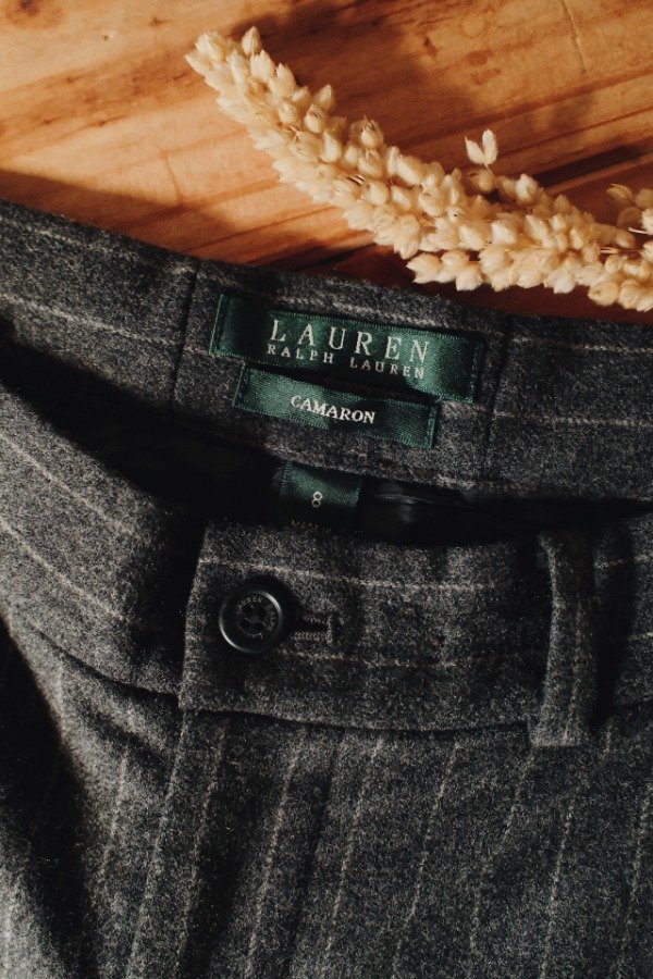 Pantalón Ralph Lauren de paño a rayas con un botón, cierre, pasacinto y bolsillos.