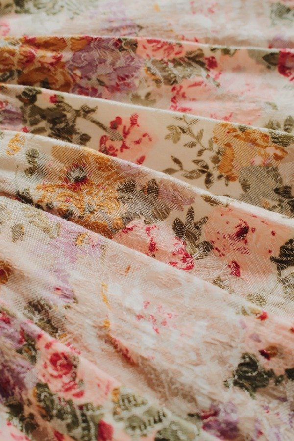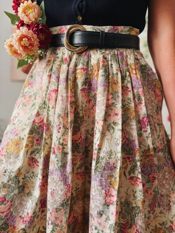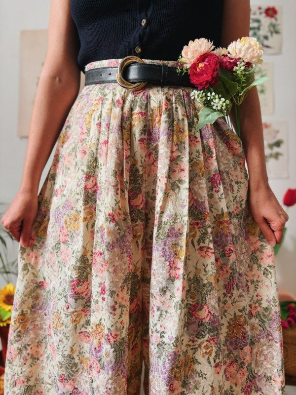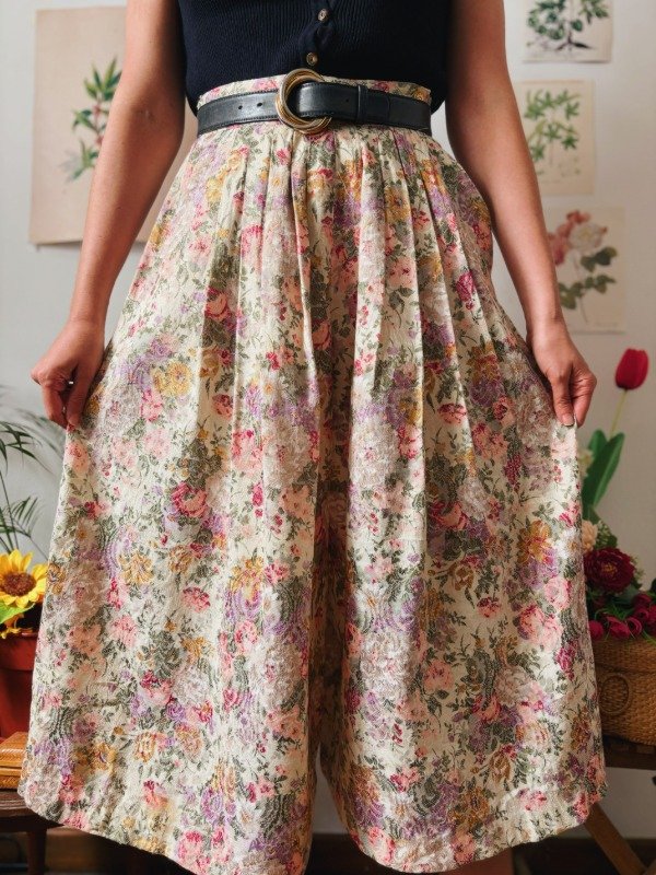 Falda pantalón de jacquard hecho en USA. Tiene tablas, botones, ganchito metálico y elástico en la parte trasera de la cintura, bolsillos.