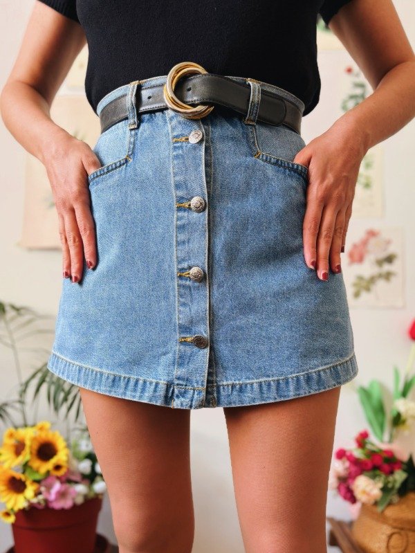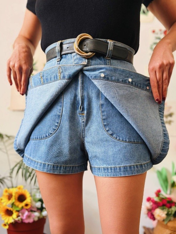 Pollera pantalón de jean con botones metálicos, cierre interno y bolsillos.