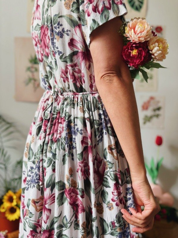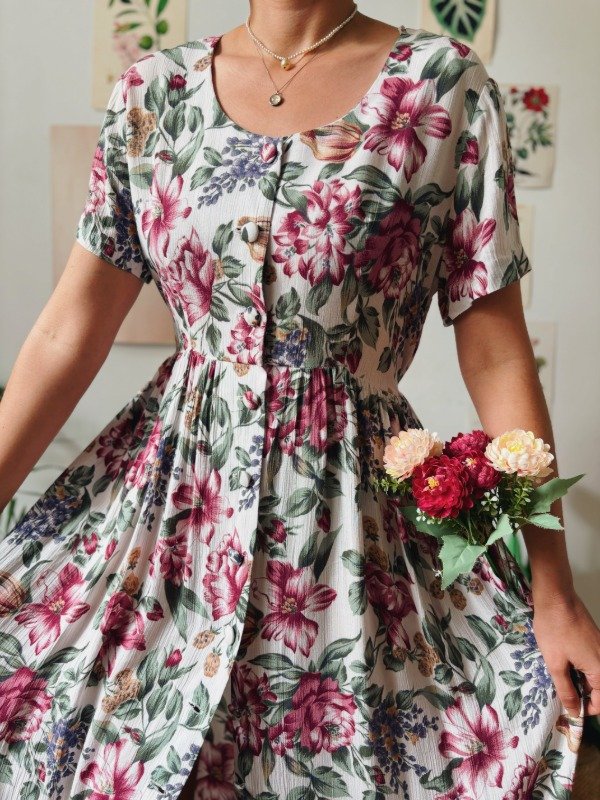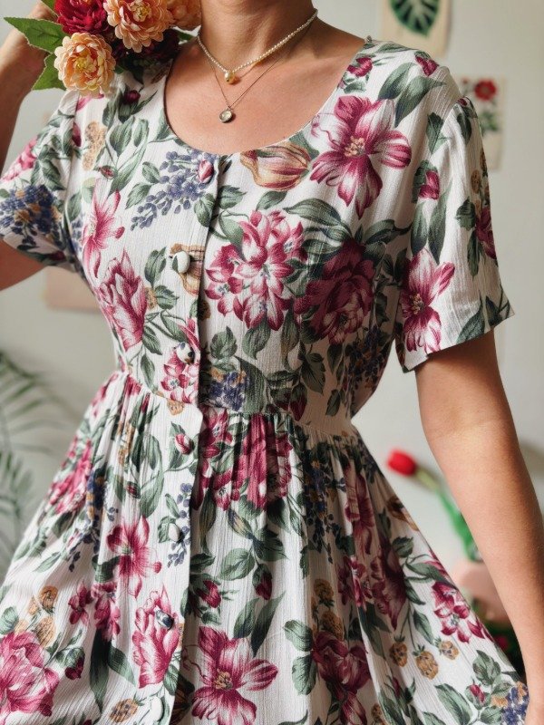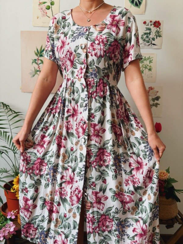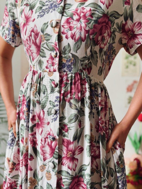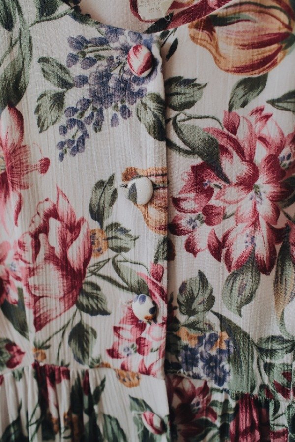 Vestido con botones entelados, tiras para ajustar en espalda y bolsillos, hecho en USA.