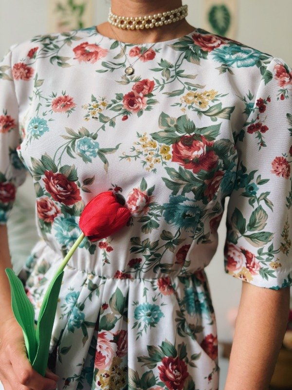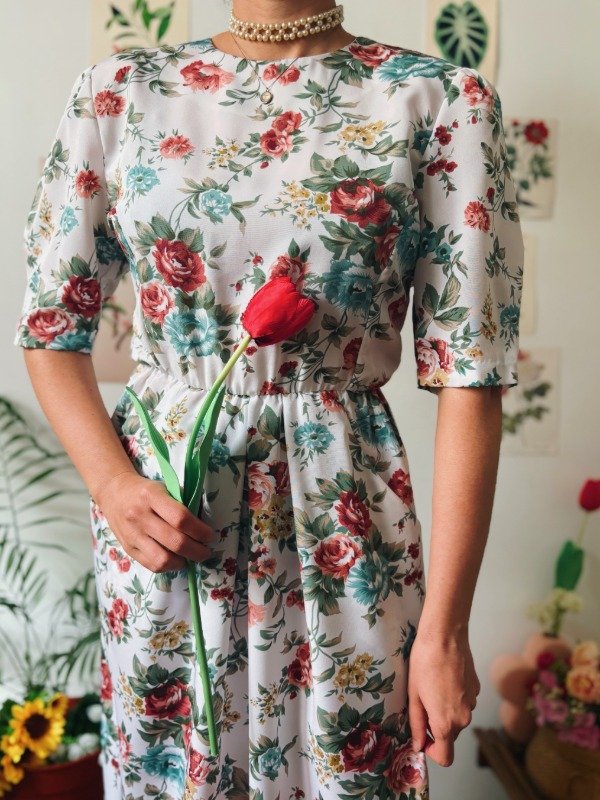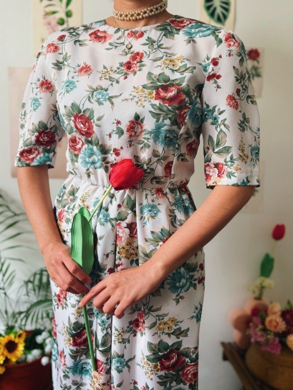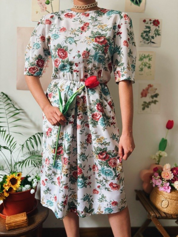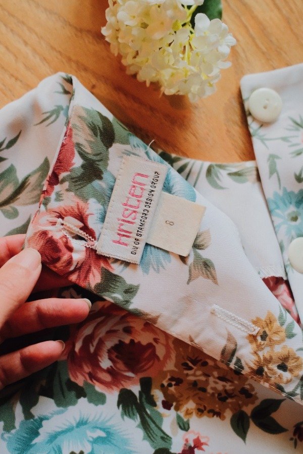 Vestido hecho en USA, con botones y cierre en espalda, bolsillos frontales y elástico en la cintura.