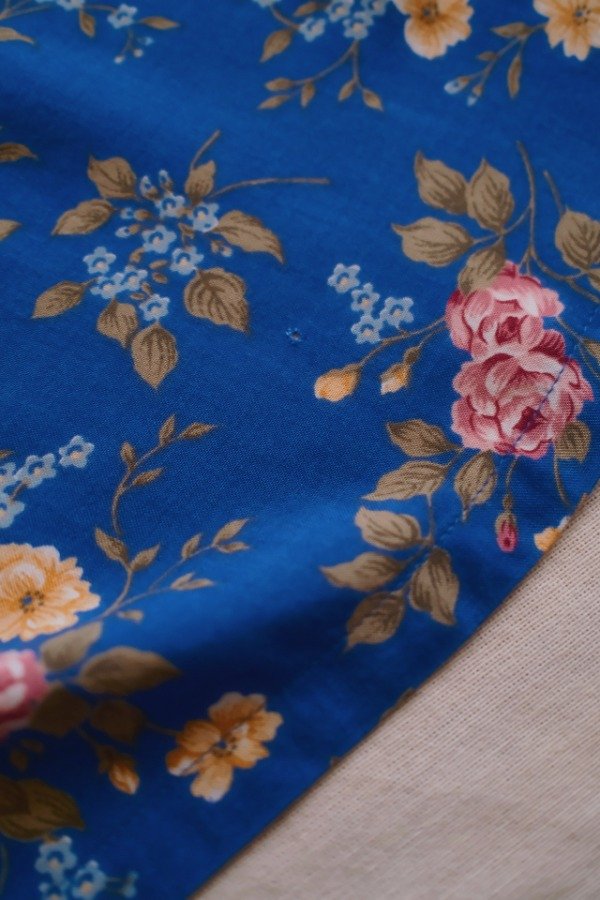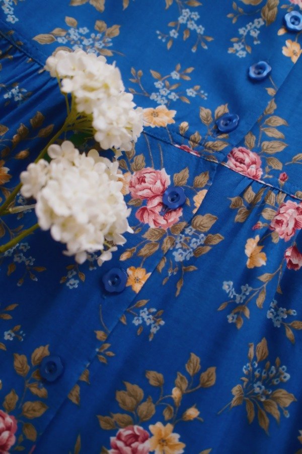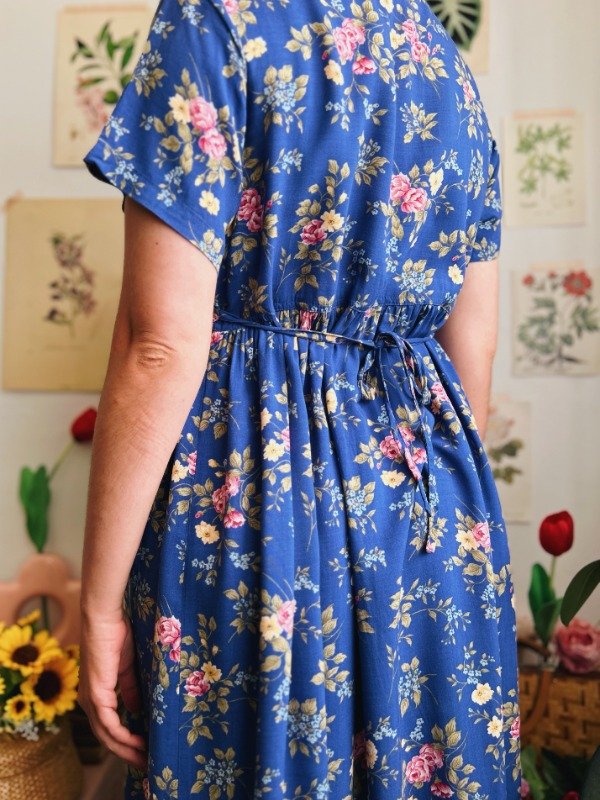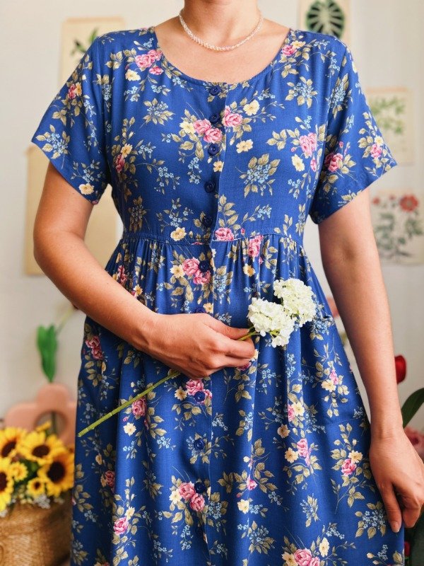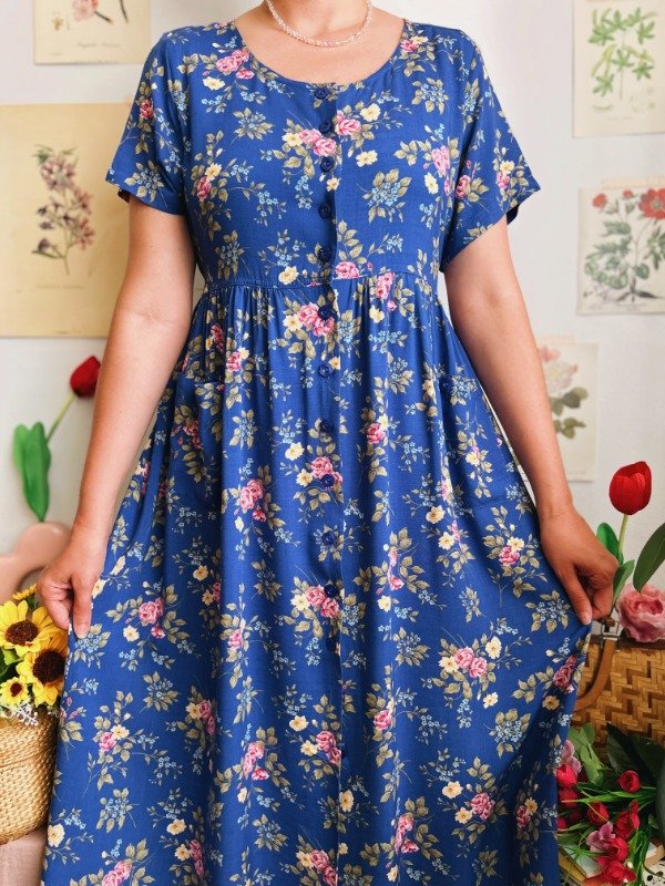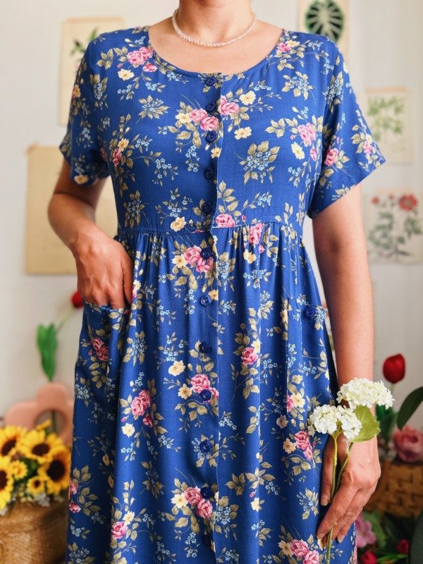 Vestido estampado con botones con forma de flor, bolsillos, lazo para ajustar en espalda. Tiene un botón de repuesto.