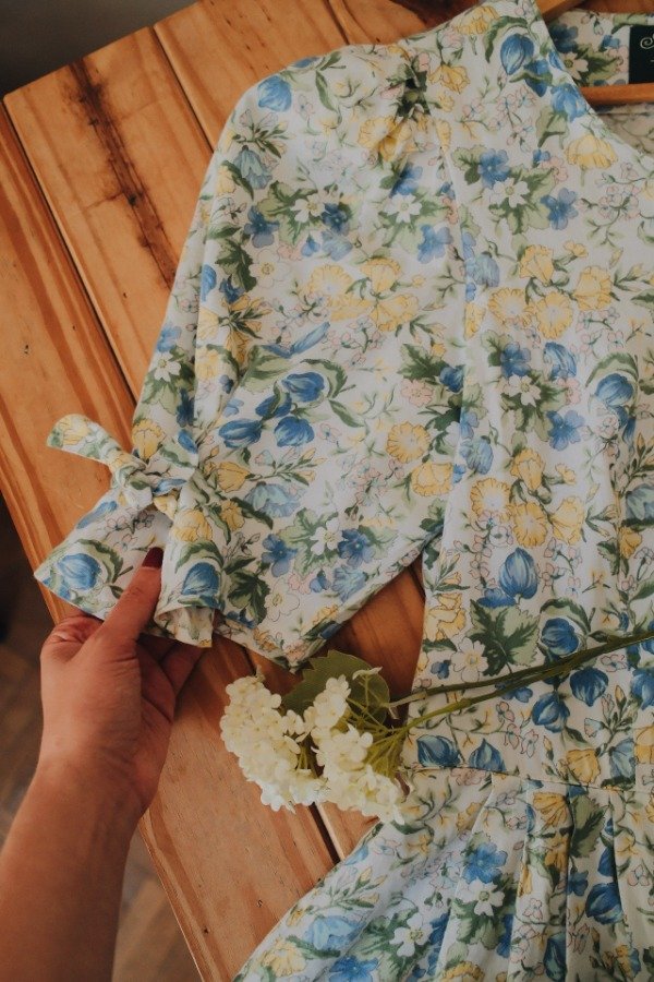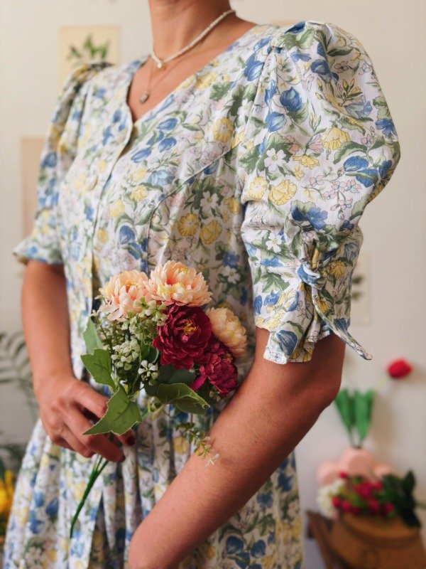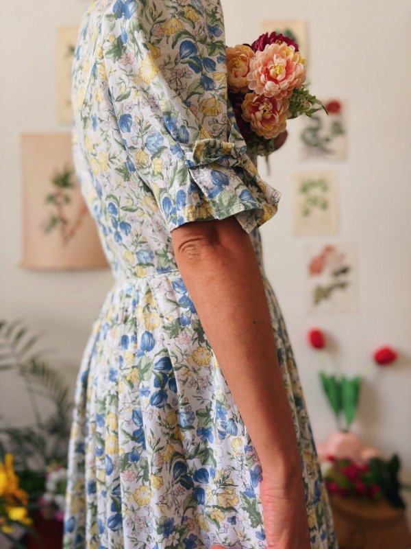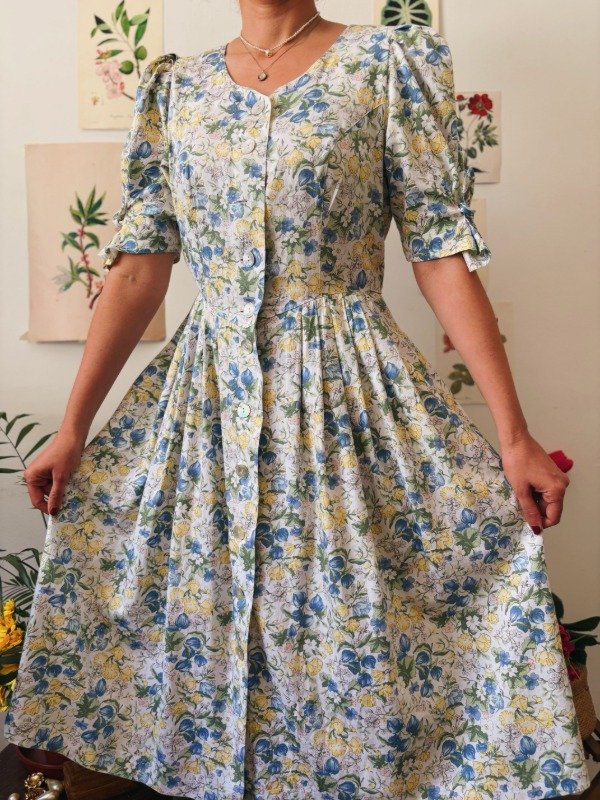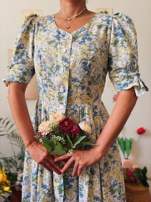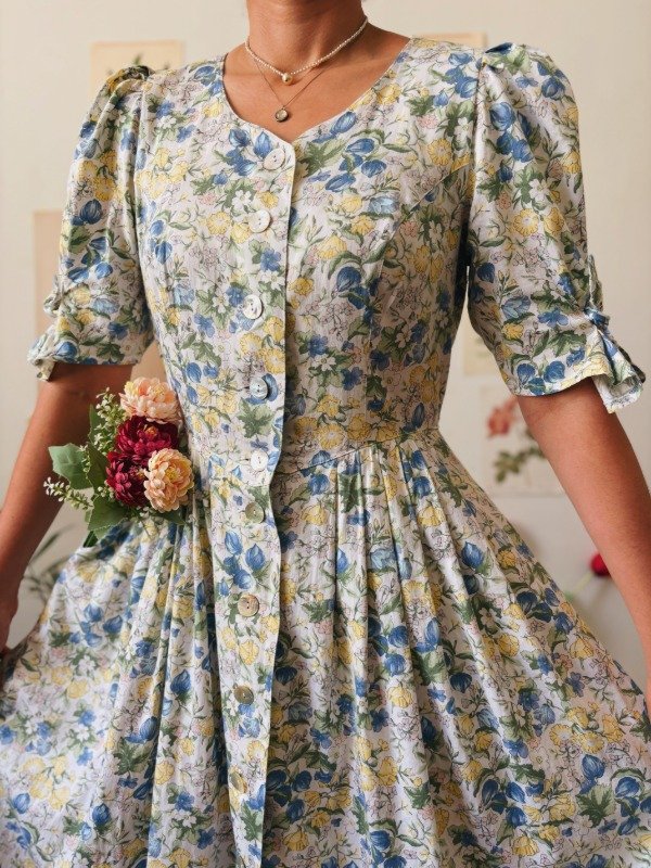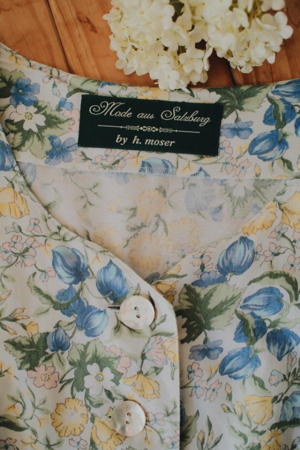 Vestido hecho en Salzburgo, estampado, con botones de nácar, lazos para ajustar mangas, bolsillos y un botón de repuesto.