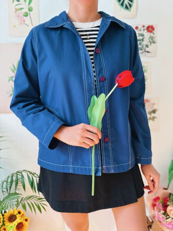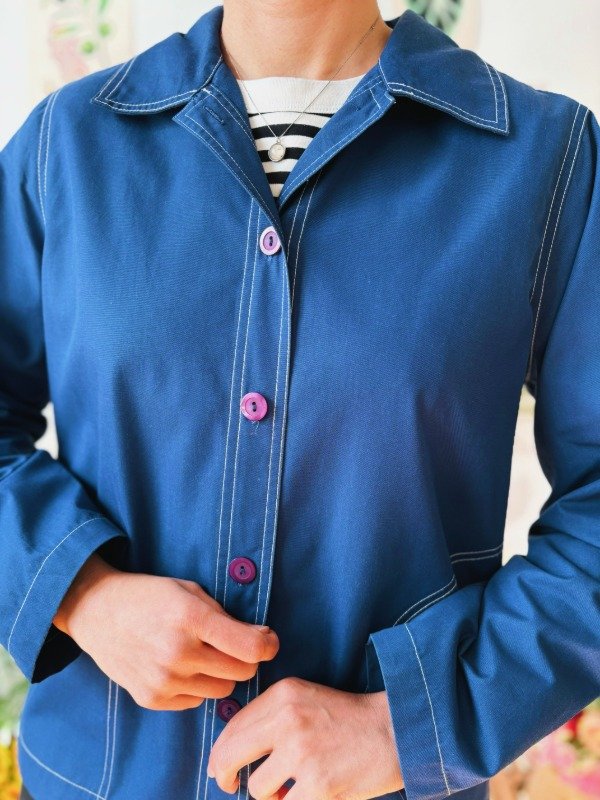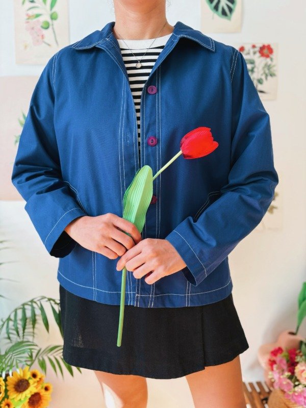Campera liviana sin forro con botones, bolsillos y costuras a contra tono. Hecha en Hong Kong.