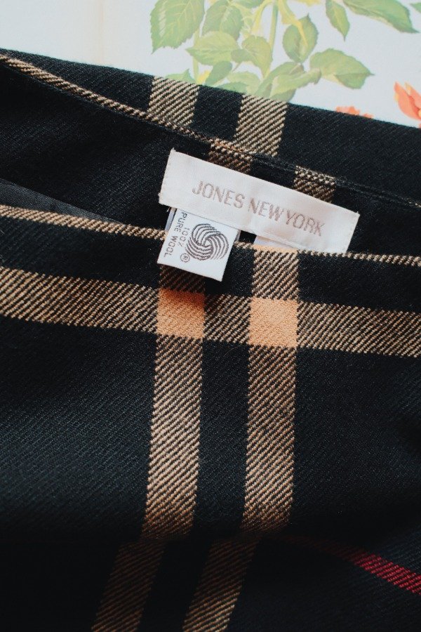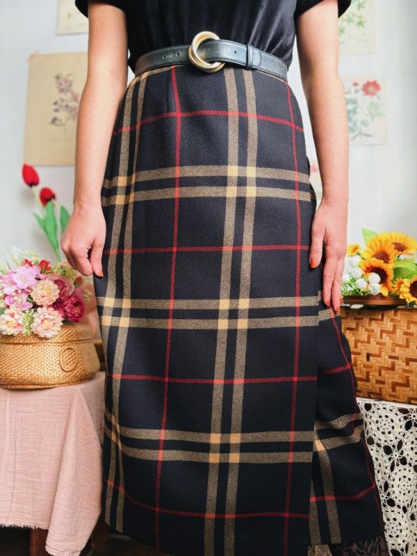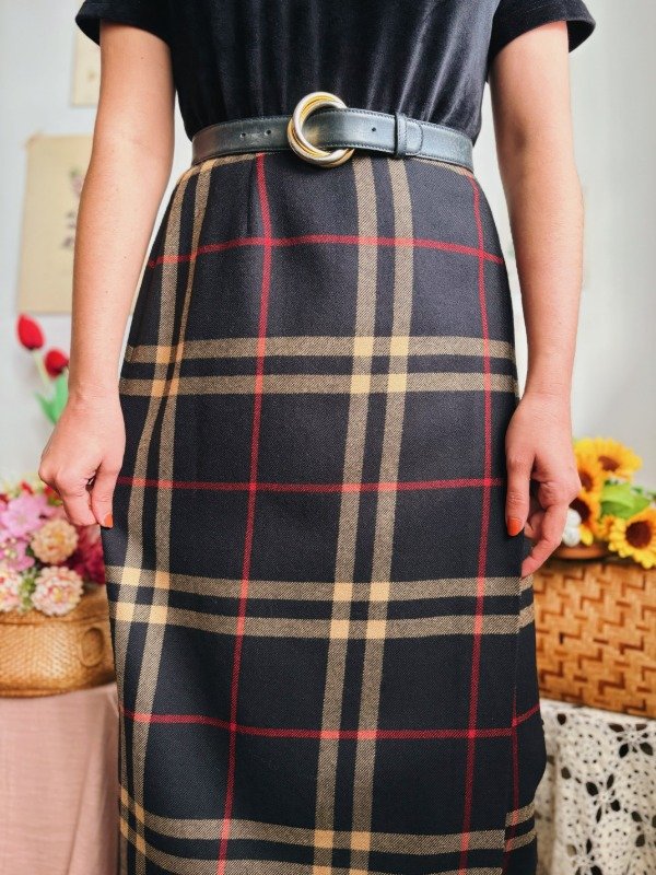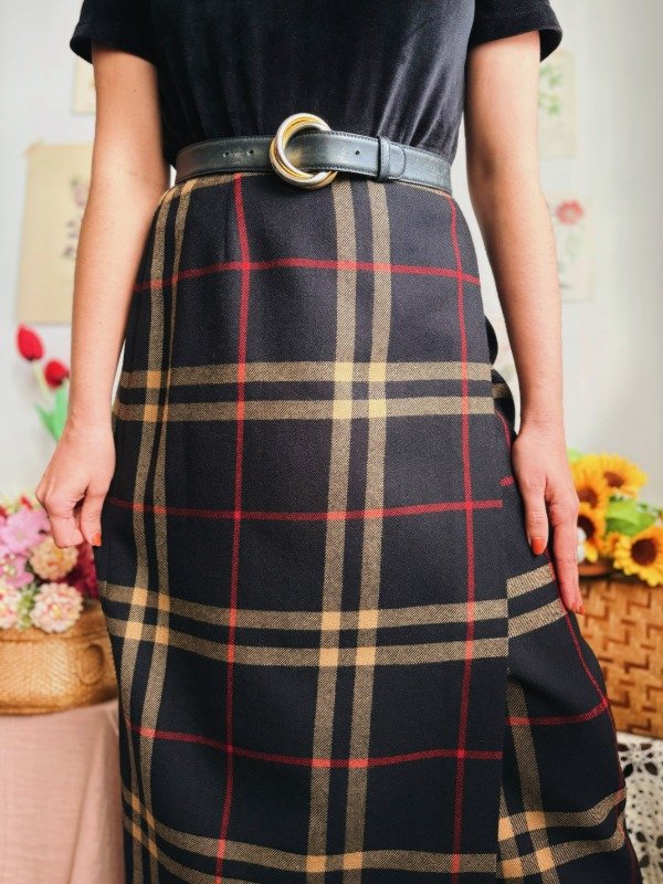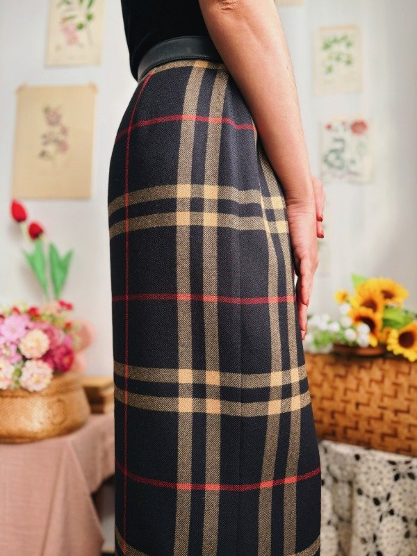 Falda portafolio con un botón y un ganchito metálico.